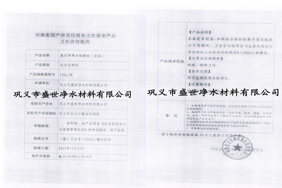 聚合硫酸鐵衛(wèi)生許可